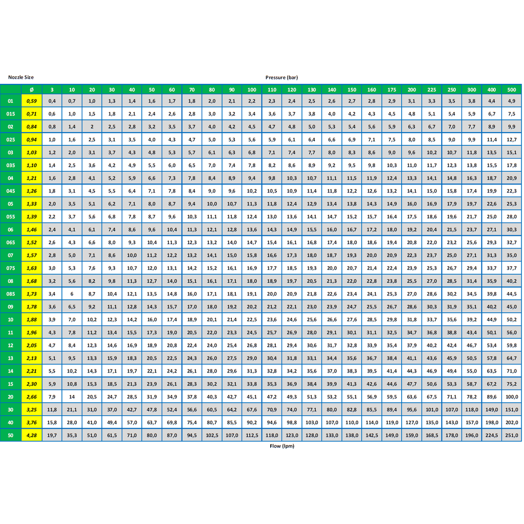 Välj spridning och storlek. Se tabell nedan för att välja rätt storlek på munstycke till din tvätt.