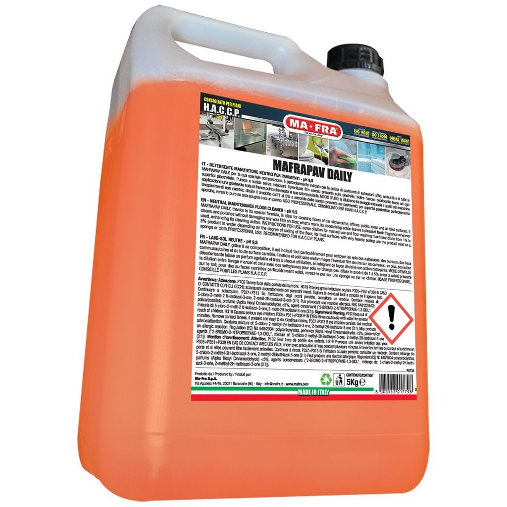 Golvskurmedel för hem, kontor, butiker och andra allmänna utrymmen. Mafrapav Daily är ett milt men effektivt golvskurmedel för de flesta typer av ytor. Passar även på kakel. Efterlämnar en härlig frisk doft. För manuell rengöring med svabb eller golvskurmaskin. Givetvis lågskummande formula.